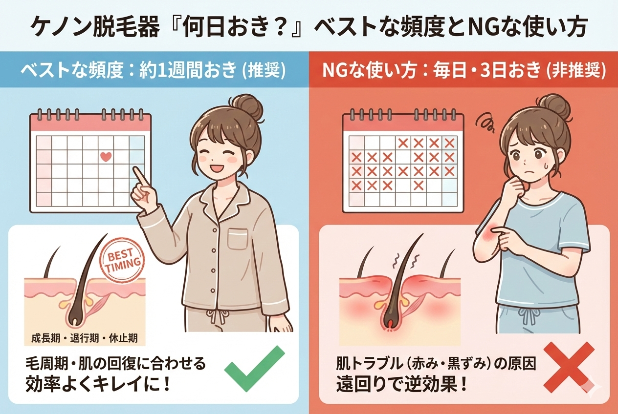- ケノン 脱毛器 何日おき?の答えは「同じ部位は約1週間おき」が基本。毎日・3日おきは肌にとってはオーバーワーク