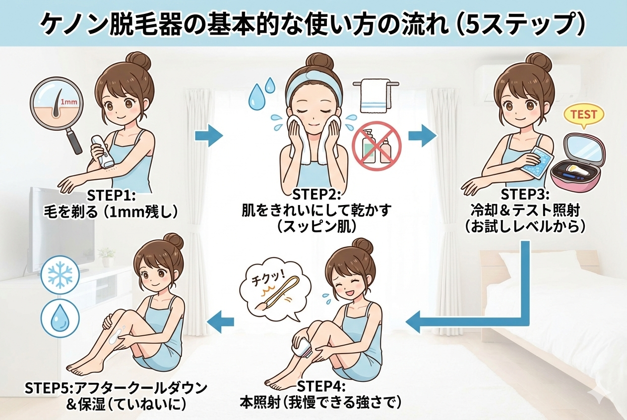 脱毛器 ケノン 使い方 の全体像は、ざっくりこの5ステップです。
