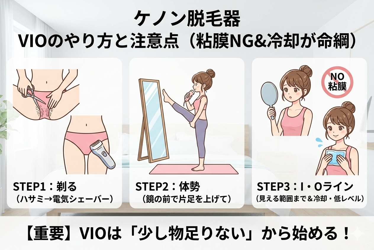 - 脱毛器 ケノン vio は、粘膜部分は絶対NG。Vラインから少しずつ、冷却と低レベルスタートを徹底する